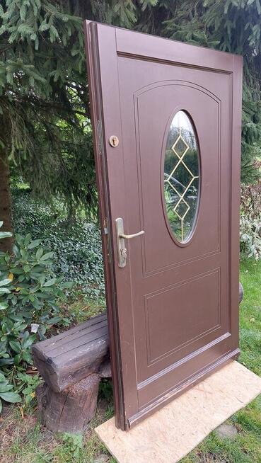 Drewniane drzwi zewnętrzne z futryną. Szerokość drzwi 100 cm W zestawie klamka wraz z zamkiem