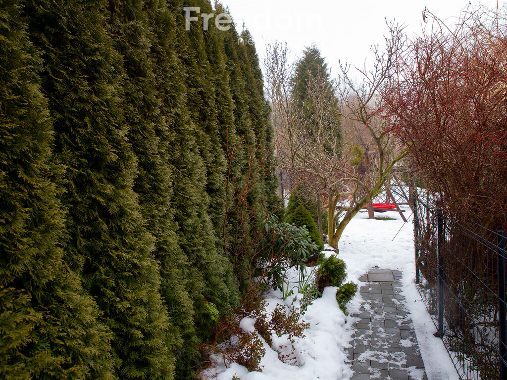 dom z ogrodem) są ogrodzone. Działka ma ksztalt wąskiego
